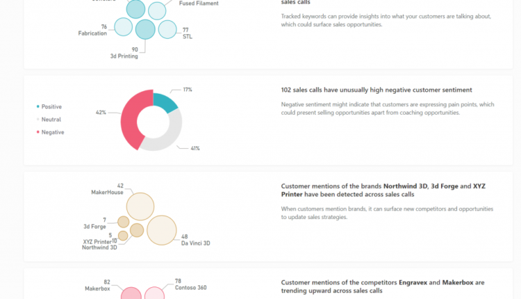 The first section provides insights on what customers are talking about in sales conversations. Sales managerscan view trending topics to pro-actively launch new sales training or sales motions. For example, consider a sales team that is trained in selling products: 3D printing and STL for the business. When the manager sees an insight that Fused Filament, another product in the company, is getting brought up frequently by customers, she can quickly launch a cross-sell motion to address this growing customer need. Similarly, trends on competitor mentions can enable sales leaders to react quickly and launch new training to defend better against competitive threats. In this release, we are also lighting up an out-of-the-box brands model, based on Bings knowledge repository, that automatically detects brand names in conversations.These brand trends can be invaluable to managers who cannot always anticipate which brands customers will talk about during conversations. While configuring tracker and competitor words previously allowed detection of known keywords, the new AI-driven model helps take content detection to the next level.