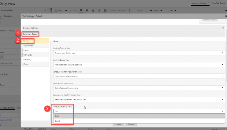 - Fixed: When searching for availability of resources on a requirement, the number of matching Resources returned in the search on the schedule assistant is limited to the value set on the field Resource Availability Retrieval Limiton the Default Metadata Settings of the Booking Setup Metadata record. The default value of Resource Availability Retrieval Limit is 100.