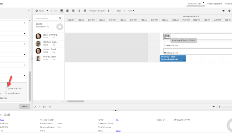 Below you will see that Ignore Travel Time is selected, and that there is a two-hour block at the beginning of the day that is recommended, which is because there is a 30 minute open block at the end of the day. That 30 minute block at the end of the day leaves the resource time to travel home.
