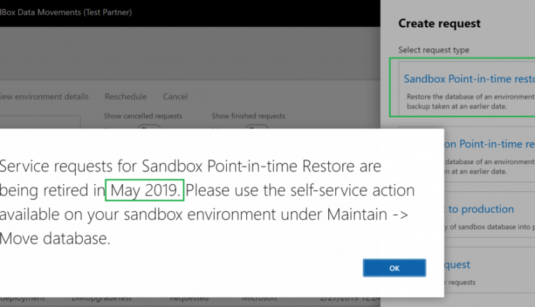 With this release, we are adding a deprecation notice for the Sandbox Point-in-time Restore (PITR) service request type. This functionality has been previously released as a self-service action and is available for on-demand use. The functionality will be entirely removed from Service Requests in May 2019.