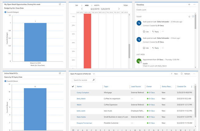 Different personas will be using different dashboards to address their needs, for instance, Relationship Manager will be using Daily Dashboard to get a high-level overview of their day, along with important charts like any Opportunities scheduled to close this week and KYCs with expiring business licenses this week.