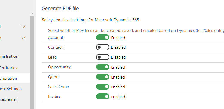 If you’re using Dynamics 365 for Sales, you can enable the feature by going to Sales Hub>App Settings>Sales Administration>PDF generation.